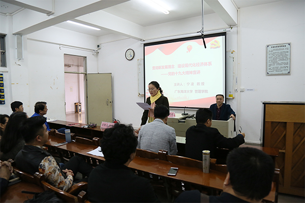 12月14日下午,动漫画 在美术楼302室举行学习贯彻党的十九大精神专题辅导报告会,管理学院院长宁凌教授作了题为《贯彻新发展理念,建设现代化经济体系》的专题报告。会议由学院党委书记冯红爱主持,学院教职工和学生干部共130余人参加。