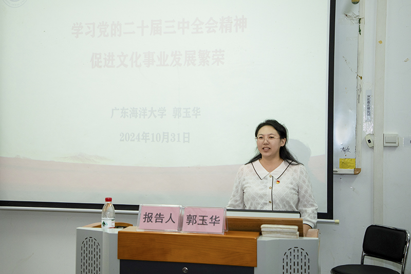 之后,郭玉华博士以“学习党的二十届三中全会精神,促进文化事业发展繁荣”为主题为大家做宣讲报告。她围绕党的二十届三中全会概况、深入领会全会关于“深化文化体制机制改革”的重要部署、学习领会党的二十届三中全会精神,促进文化事业发展繁荣三个方面对党的二十届三中全会精神进行了全面讲解,并结合学校新时代高质量发展行动方案和艺术学院实际情况,提出了具体的学习贯彻措施。宣讲报告内容丰富、深入浅出,对于大家进一步统一思想、明确方向、坚定信心、推动工作具有重要的指导意义。