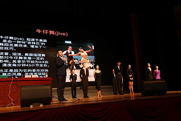 曹云飞教授从五个角度切入,深入浅出地系统论述了拉丁舞的起源、拉丁舞的五个舞种风格、拉丁舞在其他种类舞蹈的应用和拉丁舞的技术、表现形式等,讲座还穿插了现场示范展示和拉丁舞蹈专业视频。曹云飞教授对拉丁舞的敬畏与热爱,舞蹈系学生美轮美奂的拉丁舞演绎,屏幕上国际标准舞比赛的精彩视频,大家深受感染,现场气氛高涨,热烈的掌声不绝于耳。