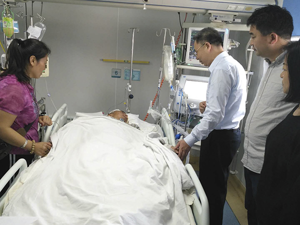 彭权群副书记向主治医生详细了解曹震同学的病情及恢复情况,向医院医生和有关领导转达学校对医院全力以赴救治学生的感谢,向家长转达各位领导的关怀和老师同学们的问候。随后关切地来到曹震同学病床前,代表学校送上学生临时困难补助和爱心慰问金,鼓励他要与疾病顽强斗争,争取早日康复,早日返回校园!曹震同学虽然不能言语,但透过他的轻微点头示意,看到了他对生命的渴望和对大家的深深感激之情。最后,曹震的母亲代表全家感谢学校领导、老师和同学们的关心和帮助。