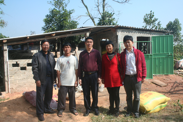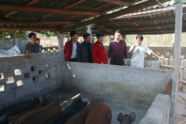 在南塘村村委会,莫钜劲书记等与学校驻村工作组组长郑旁生副处长就科技扶贫工作及有关事项进行了交流。然后,分别深入到四户贫困户,详细查看了帮扶项目的进展情况,尤其针对贫困户蒋妃伦家在养猪过程中存在的问题,刘艳芬教授为养猪户现场看猪病,开药方,热情耐心地向贫困户传授了大量科学养猪技术及疾病防治知识。