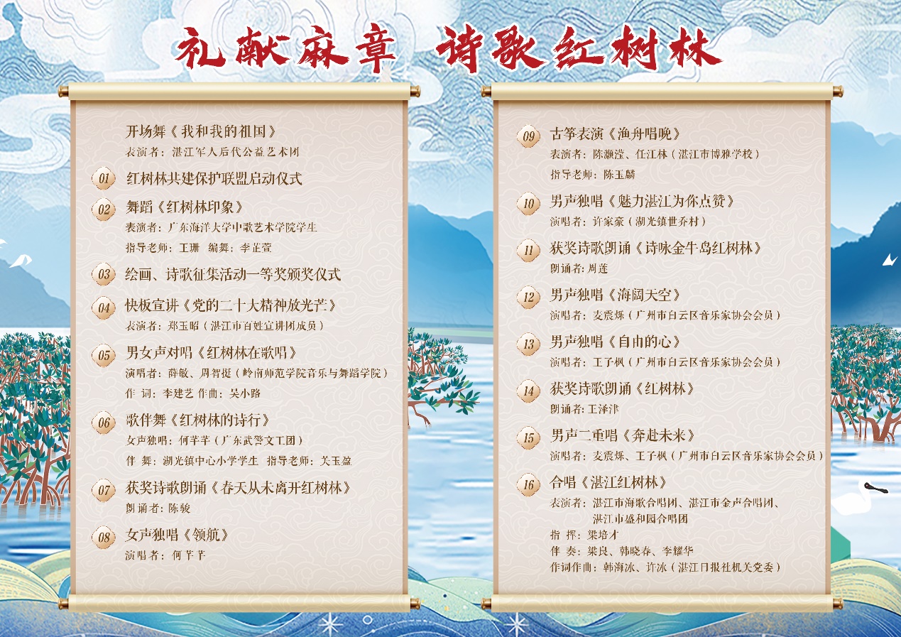 “礼献麻章·诗歌红树林”诗歌节文艺活动是麻章“牢记嘱托,让‘国宝红树林’更绿更美”主题宣传文化系列活动的重要组成部分。活动以艺为介、以美为媒,讲好红树林故事,激发大家参与红树林保护的热情,使红树林保护意识深入人心,让“麻章红树林”成为广东生态建设的新名片,为麻章生态文明建设和文旅事业发展作出积极贡献。