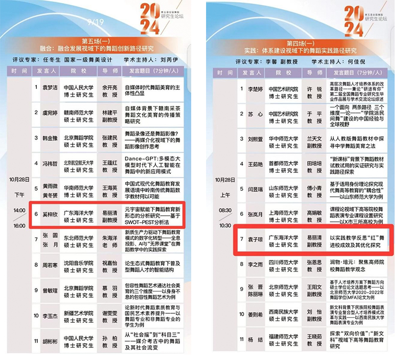 2022级舞蹈专业研究生奚梓欣和袁子琼两位同学撰写的论文《元宇宙赋能下舞蹈教育新形态的分析研究——基于SWOT-PEST分析法》、《以实践教学反思“红”舞进校成效及其优化探究》成功入选。