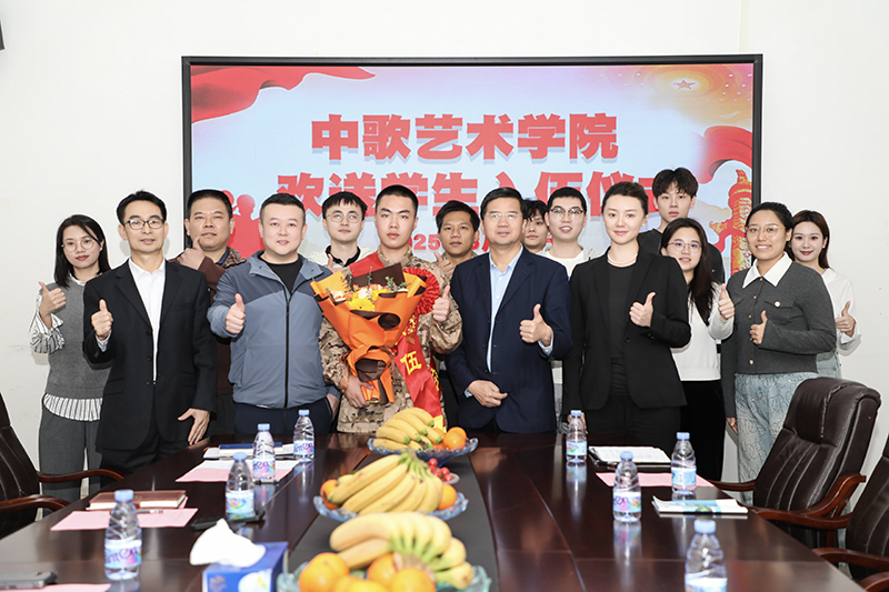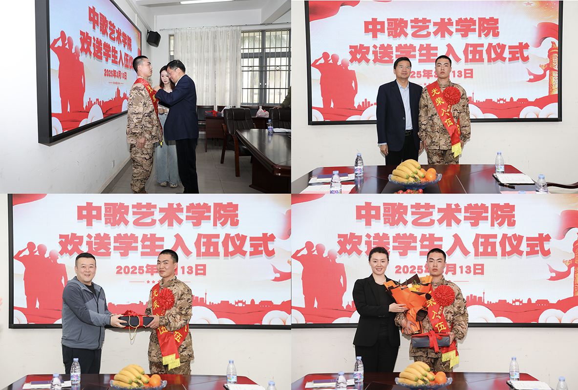 在艺海楼A208举行欢送学生入伍仪式,欢送民舞1222班尚印泉同学光荣入伍。学院党委书记欧卫军、院长李梓郡、副书记翟周、副院长刘迪以及辅导员代表、学生代表齐聚一堂,共同见证这一荣耀时刻。会议由翟周主持。