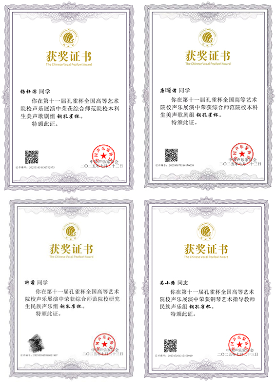 学子凭借出色的表现,赢得了专家评委的高度赞誉。最终,五名学生成功闯入总决赛,学院也荣获优秀组织奖。其中,唐晞芮、杨钰滨两名同学荣获综合师范院校本科生美声歌剧组铜孔雀奖,柳萌同学荣获综合师范院校研究生民族声乐组铜孔雀奖,吴小路老师荣获钢琴艺术指导教师民族声乐组铜孔雀奖,赵密密、高鲲、徐杰老师荣获优秀指导教师奖。
