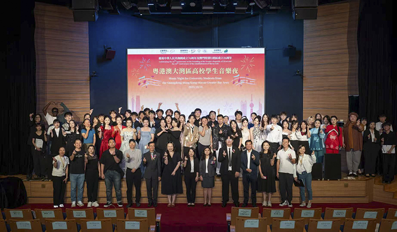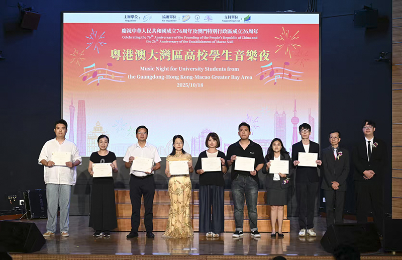 精心挑选出三名优秀学生柳萌、黄鹏臻、杨钰滨,并由学院党委书记欧卫军带队,赴澳门参加“庆祝中华人民共和国成立76周年及澳门特别行政区成立26周年粤港澳大湾区高校学生音乐夜”演出交流活动。演出共有18支高校队伍参加,活动取得圆满成功,主办方为参与学校颁发了感谢状。此次是我校连续第5年受邀参加该活动。