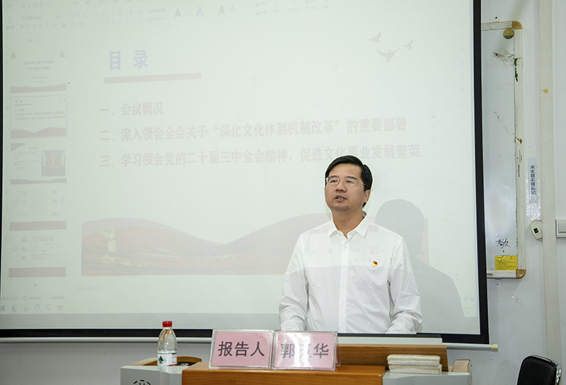 党委理论学习中心组(扩大)会议暨党的二十届三中全会精神宣讲报告会在艺海A楼302室隆重举行。学校党委理论宣讲团成员、马克思主义学院副教授郭玉华作了专题报告,宣讲会由学院党委书记欧卫军主持。学院全体教职工现场聆听了报告。